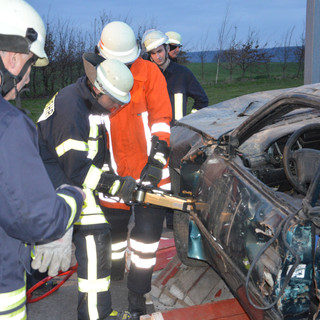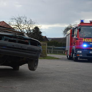 Nach kurzer theoretischer Einführung und ein paar Worten seitens der Hattendorfer Wehrführung, begann draußen der praktische Teil. Als Übungsobjekt diente ein hervorragend vorbereiteter alter PKW, der bereits stark demoliert und in Schräglage versetzt war.